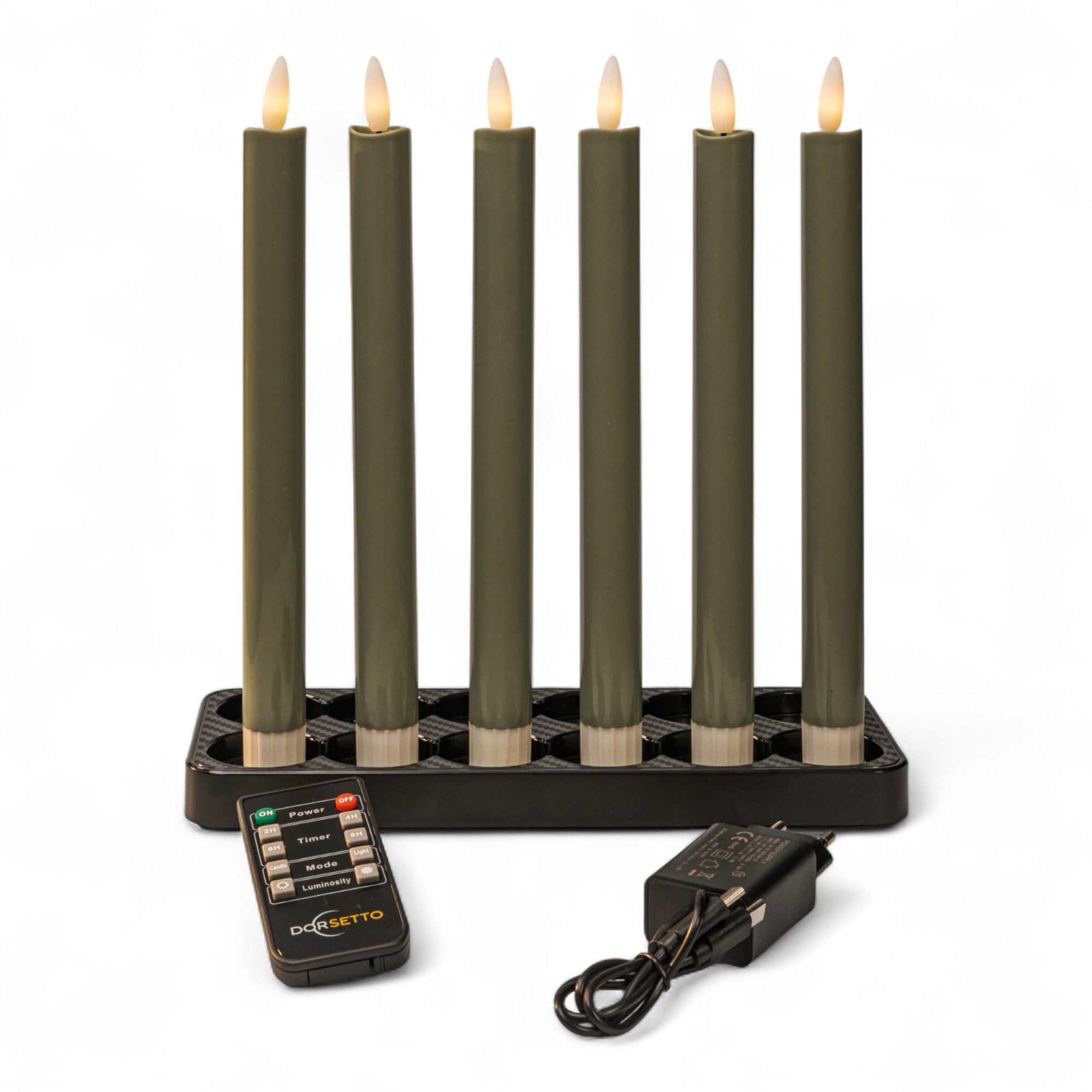 Dinerlys olivengrøn 250 mm – genopladelige, sæt med 6, dæmpbare og med fjernbetjening