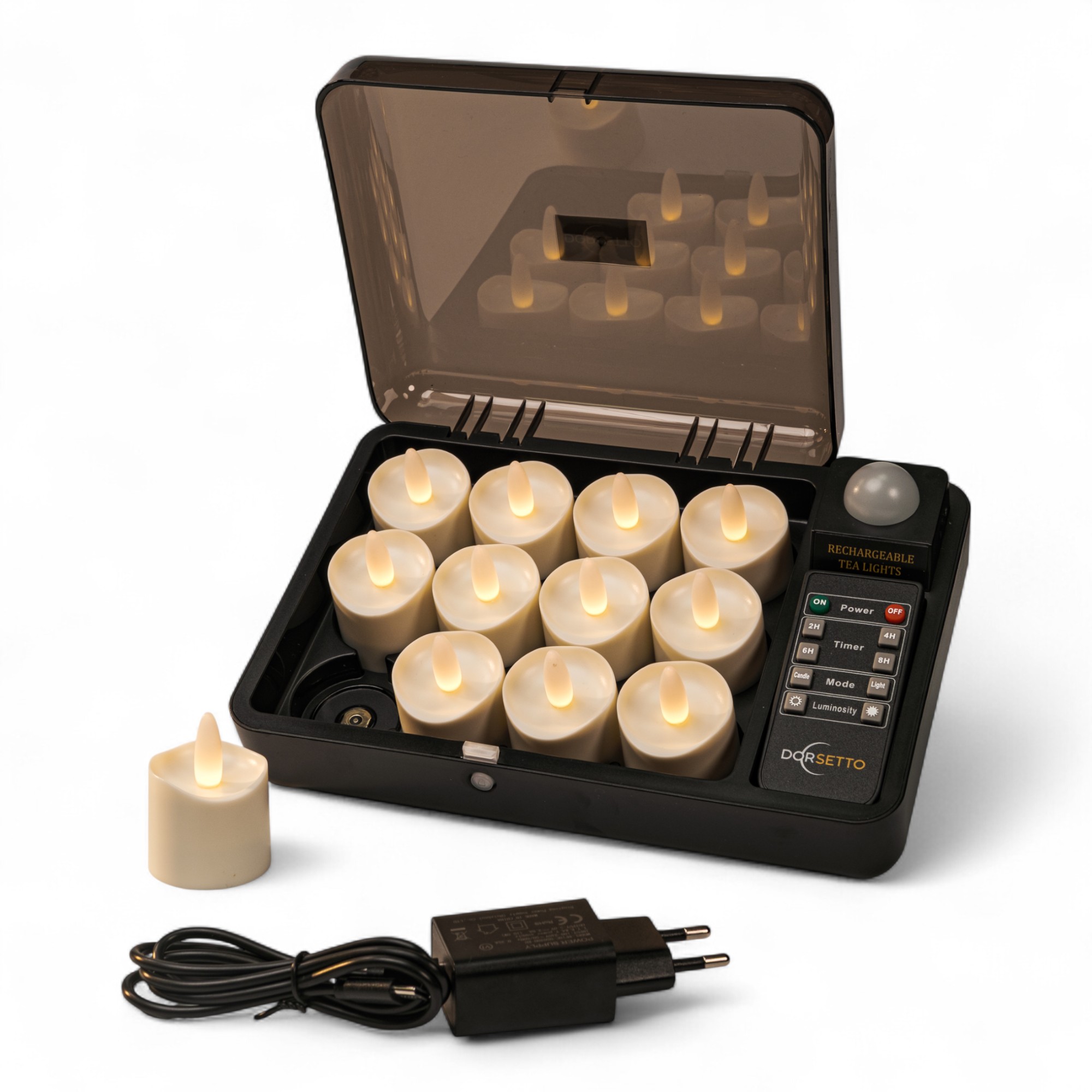 - 6 små genopladelige LED-fyrfadslys